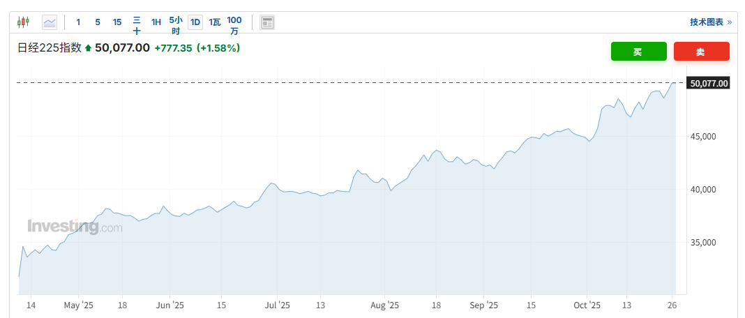 日经225指数周一首次突破50000点,韩国Kospi指数则首次突破4000点。富时中国A50指数期货也在开盘上涨0.7%。